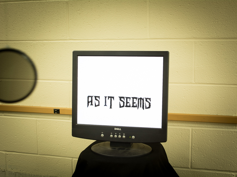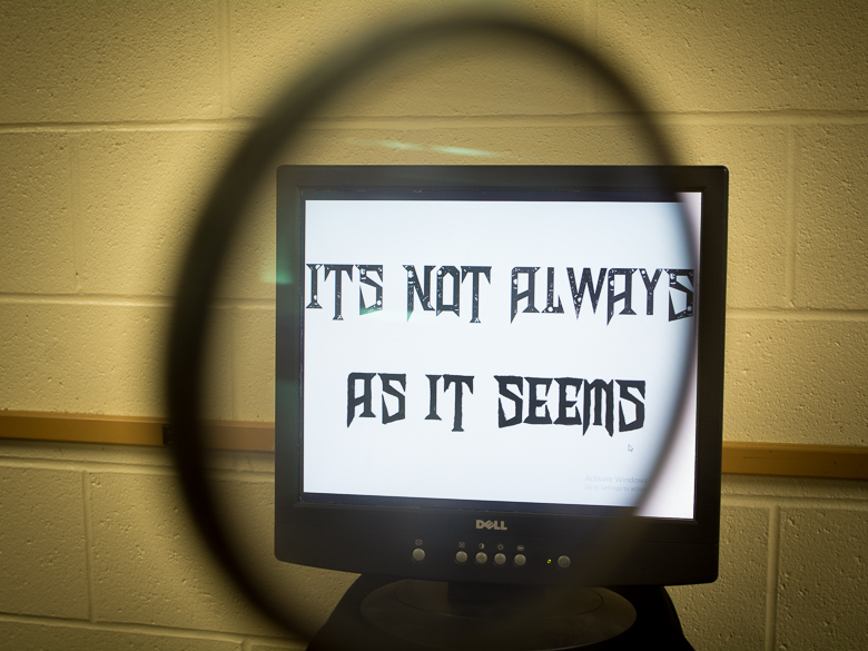 An old monitor which only reveals its full message when viewed through a polarizing lens