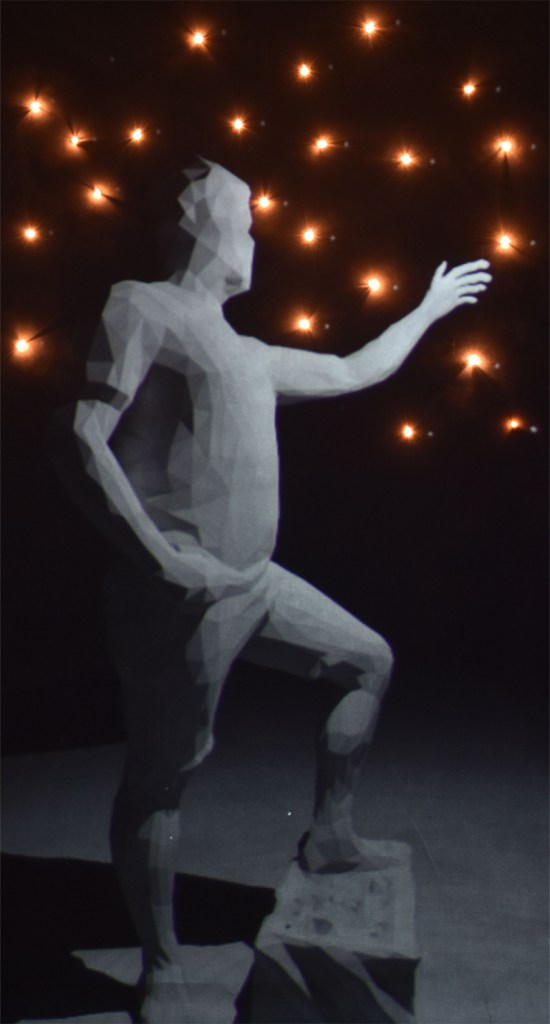 A life-sized digital projection of the artist’s body against black paper, with string lights poked through